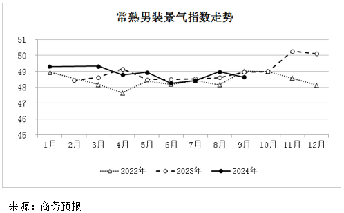 2024年9月份常熟男装景气指数为48.65点,环比下降0.7%。其中,电商景气指数46.00点,下降6.1%;市场景气指数50.59点,下降1.1%;生产景气指数46.71点,下降0.2%;采购经理人指数49.39点,上涨0.8%。