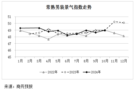 2024年10月份常熟男装景气指数为48.98点,环比上涨0.7%。其中,电商景气指数50.00点,上涨8.7%;市场景气指数51.35点,上涨1.5%;生产景气指数46.61点,下降0.2%;采购经理人指数49.08点,下降0.6%。