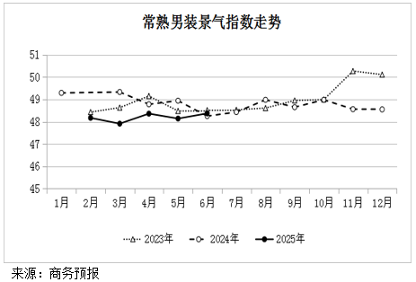 2025年6月份常熟男装景气指数为48.37点,环比上涨0.5%。其中,电商景气指数47.50点,上涨1.1%;生产景气指数45.90点,上涨0.9%;采购经理人指数48.03点,上涨0.8%;市场景气指数50.85点,上涨0.1%。