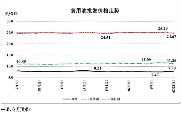 零售的品种中,豆油的零售价格11.66元/升;菜籽油的零售价格16.23元/升;调和油的零售价格14.66元/升;花生油的零售价格28.92元/升。批发的品种中,价格总体基本保持稳定。豆油的批发价格12.75元/升,环比上涨0.39%;菜籽油的批发价格20元/升,调和油的零售价格21元/升,花生油的批发价格20元/升,均与上周持平。预计近期食用油价格基本维持目前价位小幅波动。