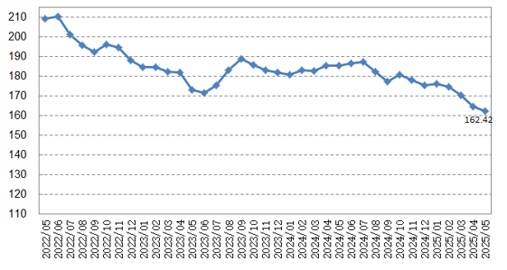 【中国国际电子商务中心独家发布】2025年5月份,中国大宗商品价格指数(CCPI)继续下降。数据显示,5月份CCPI总指数为162.42点,比上月下降2.3点,降幅1.4%;比年初下降13.9点,降幅7.9%;比上年同期下降22.9点,降幅12.4%。