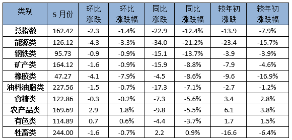 年初比来看,5月份,九大类商品价格指数呈现“六降三涨”态势。其中,橡胶类、能源类、牲畜类降幅居前,分别下降16.9%、15.7%和6.4%;农产品类、食糖类、有色金属类分别上涨3.8%、2.8%和1.5%。