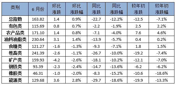 年初比来看,6月份,九大类商品价格指数呈现“五降四涨”态势。其中,橡胶类、能源类、牲畜类降幅居前,分别下降18.6%、13.3%和7.4%;农产品类、有色金属类、食糖类涨幅居前,分别上涨4.6%、2.2%和1.5%。