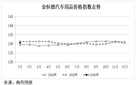 2026年1月份金恒德汽车用品价格指数为130.60点,环比上涨0.1%。其中,美容养护用品价格指数197.59点,上涨0.3%;内饰用品价格指数104.96点,外饰用品价格指数121.84点,电子用品价格指数98.02点,均与上月基本持平。