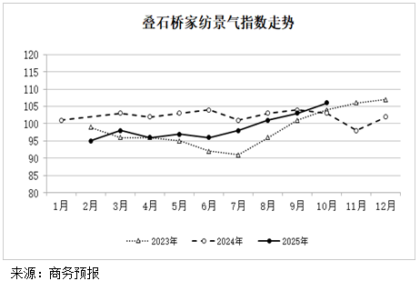 2025年10月份叠石桥家纺景气指数为106点,环比上涨2.9%。其中,50厂家指数108点,50商家指数110点,均上涨3.8%;经理人采购指数101点,上涨3.1%;生产景气指数103点,上涨3.0%;市场景气指数107点,上涨2.9%。