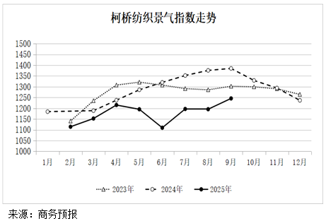 2025年9月份柯桥纺织景气指数为1245.66,环比上涨4.2%。其中,面料类景气指数1361.27点,上涨6.6%;原料类景气指数997.10点,上涨4.0%;辅料类景气指数1660.09点,上涨3.6%;家纺类景气指数1423.00点,上涨2.6%;坯布类景气指数1259.95点,上涨0.8%。