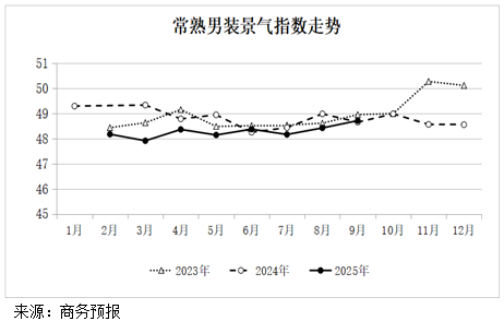 2025年9月份常熟男装景气指数为48.71点,环比上涨0.6%。其中,生产景气指数46.61点,上涨1.8%;采购经理人指数49.00点,上涨0.7%;市场景气指数50.80点,下降0.5%;电商景气指数47.50点,下降2.6%。