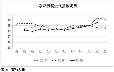2025年11月份常熟男装景气指数为49.46点,环比上涨1.1%。其中,电商景气指数50.00点,上涨2.0%;生产景气指数47.59点,上涨1.9%;市场景气指数51.33点,上涨0.5%;采购经理人指数49.76点,下降0.3%。