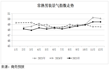 2025年12月份常熟男装景气指数为49.46点,与上月持平。其中,电商景气指数51.00点,上涨2.0%;市场景气指数51.62点,上涨0.6%;生产景气指数47.29点,下降0.6%;采购经理人指数49.00点,下降1.5%。