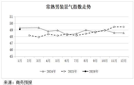 1月份常熟男装景气指数为49.09点,环比下降0.7%。其中,电商景气指数49.00点,下降3.9%;市场景气指数50.74点,下降1.7%;采购经理人指数49.09点,上涨0.2%;生产景气指数47.44点,上涨0.3%。