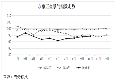 2025年10月份永康五金景气指数为94.18点,环比上涨0.4%。其中,经营效益指数93.06点,上涨1.8%;市场需求指数92.33点,上涨0.8%;总体判断指数92.70点,下降0.2%;要素供给指数100.29点,下降0.6%。