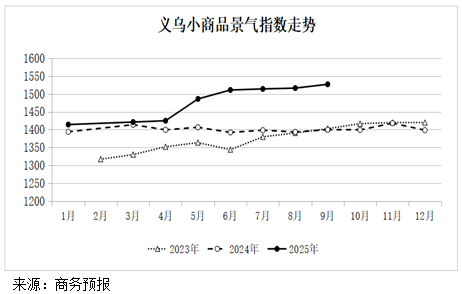 2025年9月份义乌小商品景气指数为1526.91点,环比上涨0.7%。其中,资金活跃指数1325.00点,上涨13.9%;物流服务指数1547.21点,上涨5.7%;顾客人气指数1228.56点,上涨0.3%;规模指数1846.03点,商户信心指数1120.06点,均上涨0.1%。