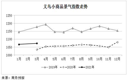 2021年3月份义乌小商品景气指数为1073.74点,比1月份上涨0.6%。其中,效益指数1376.91点,上涨4.9%;市场信心指数1016.69点,上涨0.8%;规模指数889.14点,下降4.1%。春夏时令产品陆续上市,旅游休闲、文化办公、首饰、玩具类商品行情趋旺,预计后期义乌小商品景气指数将走高运行。