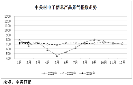 2024年2月份中关村电子信息产品景气指数为739.75点,环比上涨1.3%。其中,信心指数420.67点,上涨4.2%;规模指数785.93点,上涨0.6%;效益指数1097.90点,下降0.4%。监测的十大类产品中,摄像机、镜头和主板涨幅居前,分别上涨4.0%、4.0%和3.7%。随着市场需求持续恢复,预计后期该指数继续上涨。