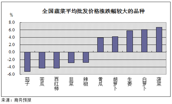 据商务部监测,7月20日至26日,30种蔬菜平均批发价格与前一周持平。其中,15种蔬菜价格环比不同幅度下降,茄子、苦瓜、西红柿批发价格分别下降5.2%、4.3%和4.3%。受天气因素影响,预计短期内蔬菜价格小幅波动。