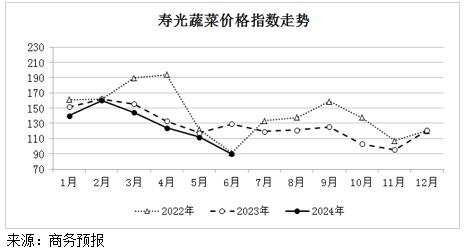 2024年6月份寿光蔬菜价格指数为89.80点,环比下降19.9%。其中,茄果类、叶菜类和白菜类价格指数降幅居前,分别下降38.2%、27.8%和26.7%。