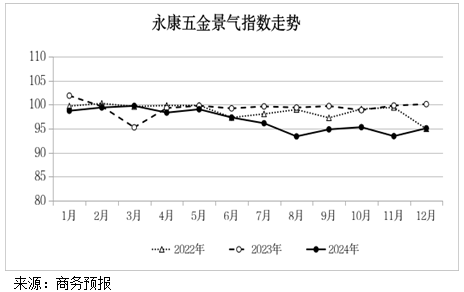 2024年12月份永康五金景气指数为95.08点,环比上涨1.8%。其中,经营效益指数93.90点,上涨2.3%;市场需求指数92.76点,上涨2.0%;总体判断指数95.43点,上涨1.5%;要素供给指数99.21点,上涨1.4%。
