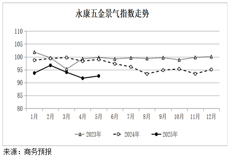 2025年5月份永康五金景气指数为92.58点,环比上涨0.9%。其中,总体判断指数92.82点,上涨2.0%;经营效益指数89.63点,上涨1.5%;市场需求指数88.36点,上涨1.0%;要素供给指数101.48点,下降1.0%。