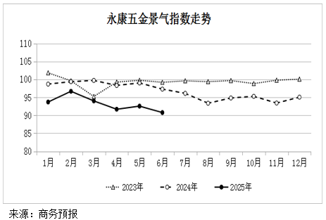 2025年6月份永康五金景气指数为90.79点,环比下降1.9%。其中,市场需求指数85.04点,下降3.8%;总体判断指数89.88点,下降3.2%;经营效益指数86.94点,下降3.0%;要素供给指数104.64点,上涨3.1%。