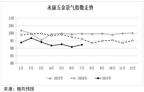 2025年7月份永康五金景气指数为92.31点,环比上涨1.7%。其中,市场需求指数88.39点,上涨3.9%;经营效益指数89.10点,上涨2.5%;总体判断指数91.26点,上涨1.5%;要素供给指数102.95点,下降1.6%。